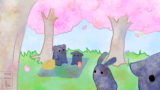ピンク色になった謎の生き物と桜のイラスト 日常