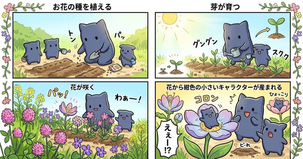 4コマ漫画も作ってもらいました。お花の種を植えて→芽が育って→花が咲いて→花から謎の生き物が産まれる!という予想外の展開になっています。かわいい。