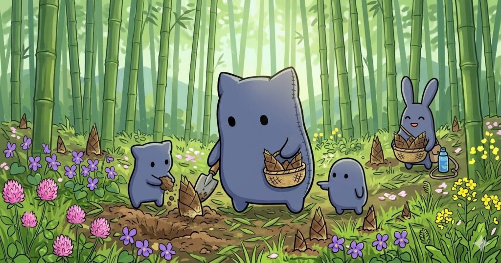 去年のタケノコキャンプの写真を見返していたら急にタケノコ欲が爆発してしまい、Geminiさんにタケノコを描いてもらいました。
