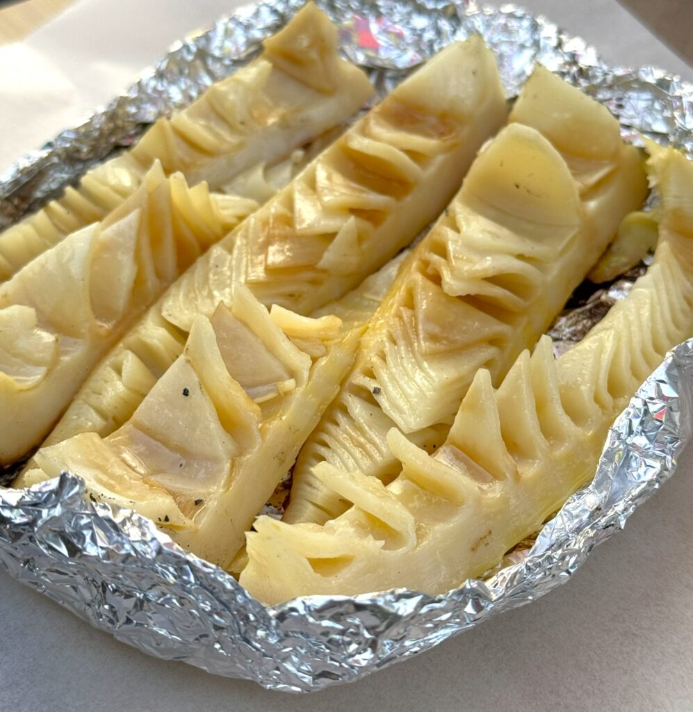 去年のタケノコキャンプでは、採れたてのタケノコをどっさりいただいて、アボカドや豆腐と合わせたサラダにしたり、アルミホイルに包んで丸ごと焼いたり。焼きタケノコは香ばしくてやみつきになりました。