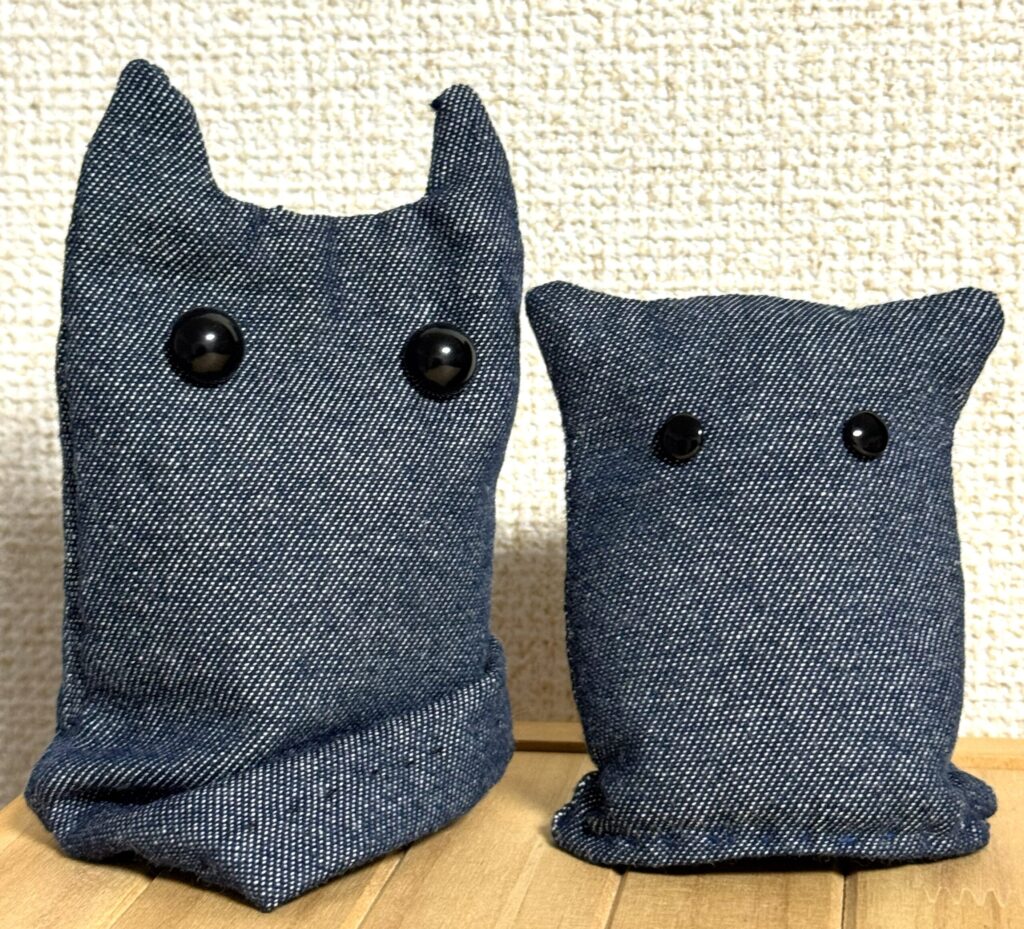 「紺色の布を被った謎の生き物」のぬいぐるみを作りました 作ったものたち 2026.03.28 以前の日記で試作を作ったアイコンのぬいぐるみ、今回は型紙からちゃんと作りました! 型紙はナノバナナさんに設計していただきました。前回の試作と比べると、やっぱり型紙があると仕上がりが全然違いますね。ちゃんとした形になって嬉しいです